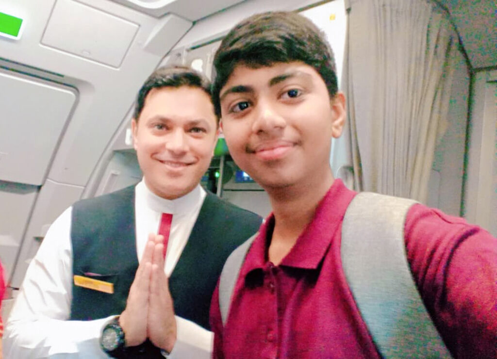 Shriyansh Vaidya pulled out his phone for a quick selfie with the Air India crew. “They were so kind to us, it felt like we were special guests,” he says.