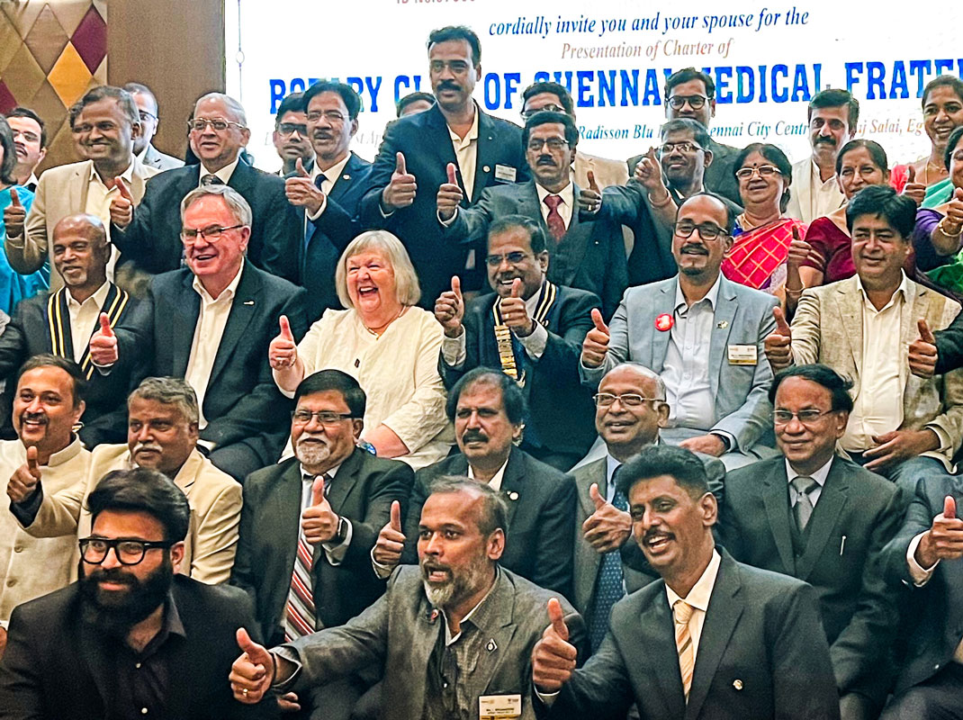 It is heartwarming to see this huge gathering of doctors who want to volunteer their services to the community through Rotary. A big ‘thank you’ to each one of you. I am sure you will have the best experience of your life and feel you have made the right choice in joining Rotary to do good in the world,” said RIPE Gordon McInally, welcoming the 97 green members of the newly-formed RC Chennai Medical Fraternity, during his visit to Chennai. All members of the new club, sponsored by RC Chennai Gemini, RID 3232, are either doctors, hospital owners or administrators. McInally handed over the charter to the new club president Dr S Muthukumar, orthopaedic surgeon and chairman of a Chennai hospital.