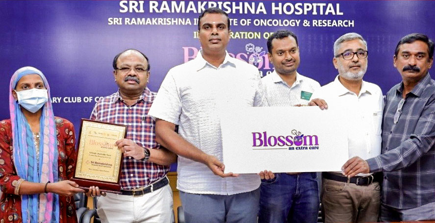 Launch of Project Blossom at the Ramakrishna Hospital, Coimbatore. From second right: RC ­Coimbatore Meridian ­charter president R Thamilselvan, president Radhakrishnan, R Sundar, ­managing trustee, SNR Sons Charitable Trust, Dr P Guhan, director, Ramakrishna Institute of ­Onology and Research, and Bindhu, a beneficiary of the project.