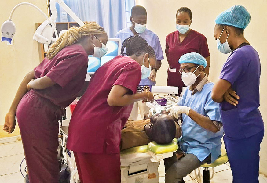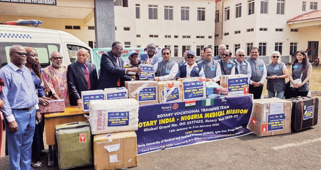A Vocational Training Team (VTT) comprising 14 surgeons and two volunteers from across India provided medical and surgical treatment during a 15-day mega health camp held in Nigeria in January. The team represented diverse medical specialties and was led by dental surgeon and RID 3204 PDG Dr Santosh Sreedhar, while PDG Lawrence Okwor served as the project coordinator in Nigeria (RID 9127).