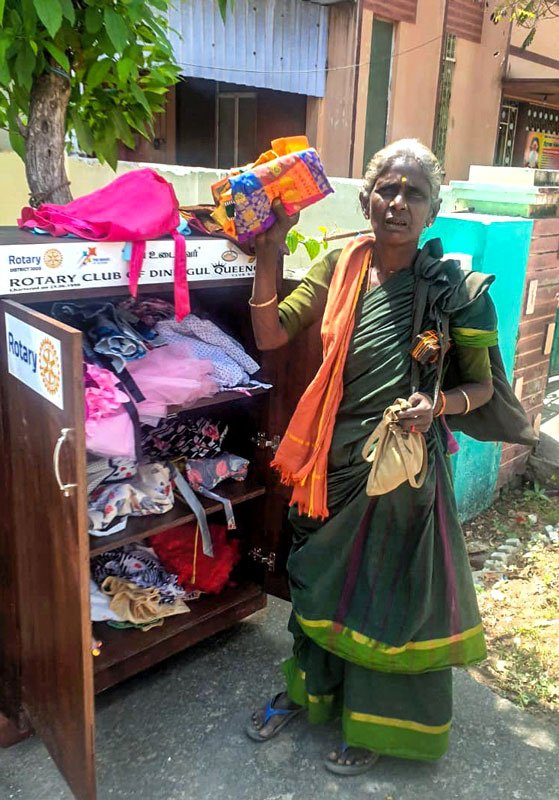Quite often, it comes naturally to women to find simple solutions to major problems. This has been proved once again by members of the all-women Rotary Club of Dindigul Queencity, RID 3000, Tamil Nadu. In a remarkable act of community service, these women Rotarians have placed three open cupboards filled with clothes for women and children at the Dindigul Government Hospital (two) and the Rotary Hall in the city. These cupboards offer free, round-the-clock access to used clothing for those in need. “Ours is an all-women’s club and we felt that if we allow the choice to the women to select the clothes they want, and without their being supervised, it would give them a lot more dignity, than somebody handing out the clothes to them,” says club member Aarthy Mukesh, who edits the club’s bulletin.