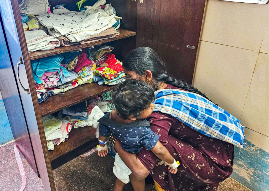 A woman with her child picking up clothes from a Rotary cupboard at the Dindigul Government Hospital.
