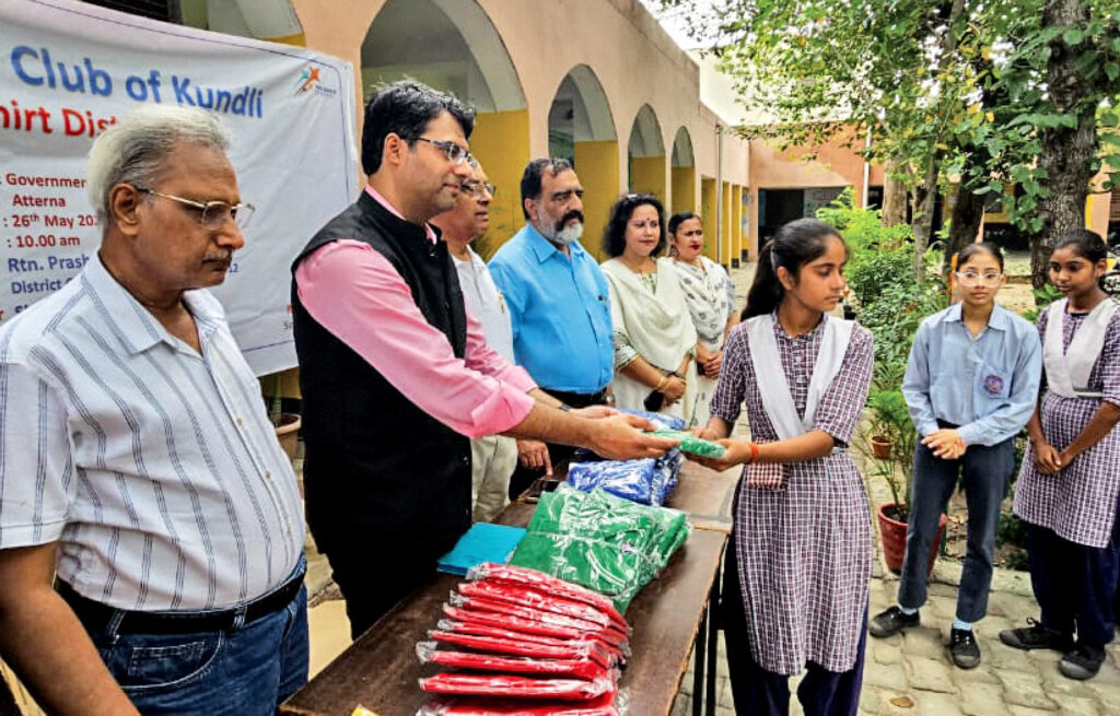 T-shirts were distributed to 650 students at the Government Senior Secondary School, Aterna, in Sonipat in the presence of DG Sharma who appreciated the club for taking up a range of educational projects. In his address, club president Shikhar Sharma advised the students to “prepare for the future by taking part in competitions.”