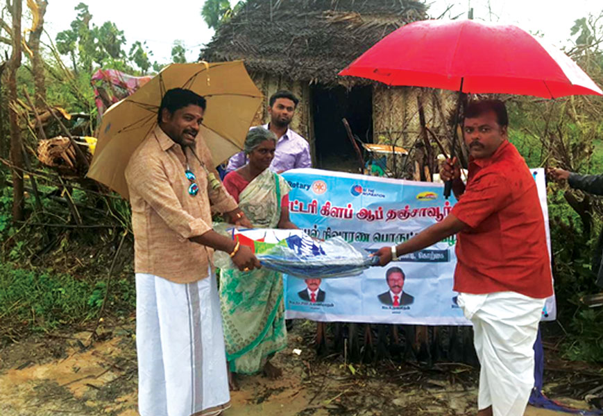 Relief material worth ₹6.5 lakh was distributed to Gaja cyclone victims who were sheltered at 18 camps across 10 villages in Thiruthuraipoondi taluk. The funds were received from the Japan Tamil Sangam.