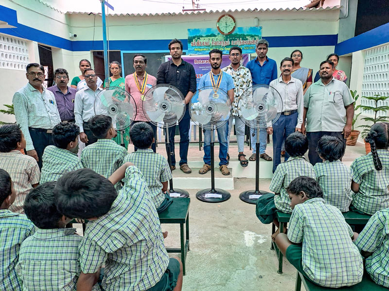 Rotaractors from RAC Dharapadavedu donated pedestal fans (₹23,000) to Kalvi Ulagam Sivanadam High School, Katpadi, in the presence of District Rotaract chairman J Hari and club president Ravichandran.