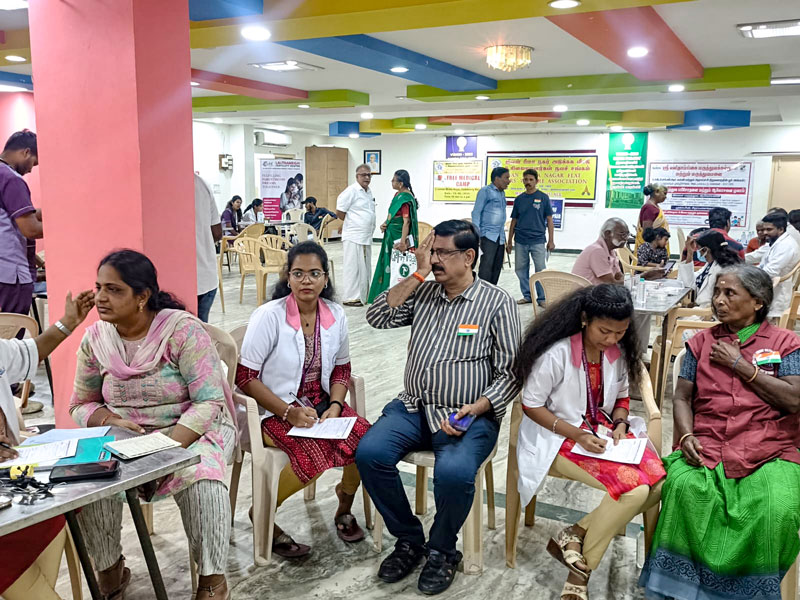 Eighty-five people were examined for general health issues at a medical camp held jointly with Sri Lalithambigai Medical College and Hospital. Medical tests were done, consultations given, and medicines were prescribed.