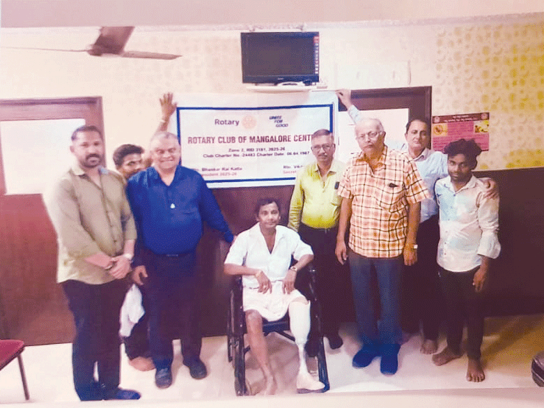An artificial limb (₹2.1 lakh) was donated to Babu, a rural poor, whose left lower limb was removed due to diabetic gangrene. PDG B Devdas Rai mobilised the funds and gifted the prosthetic limb to the beneficiary.