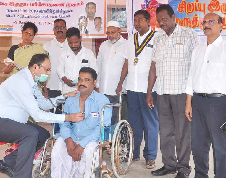 A mega health camp was organised with the support of Sahyadri Narayana Multi Specialty Hospital, Shimoga. Over 300 patients were examined and medicines worth ₹40,000 were distributed.