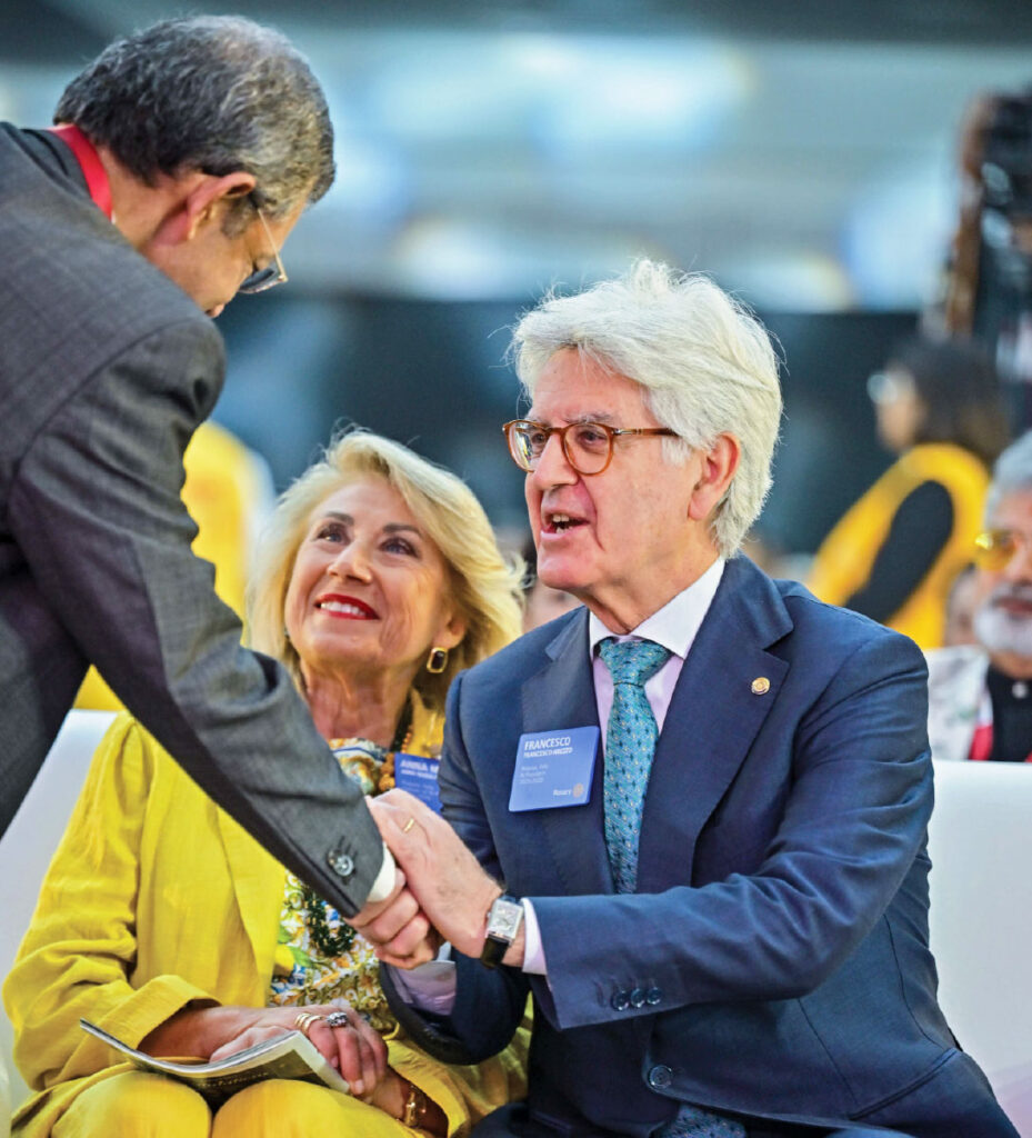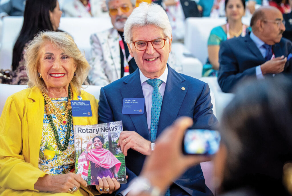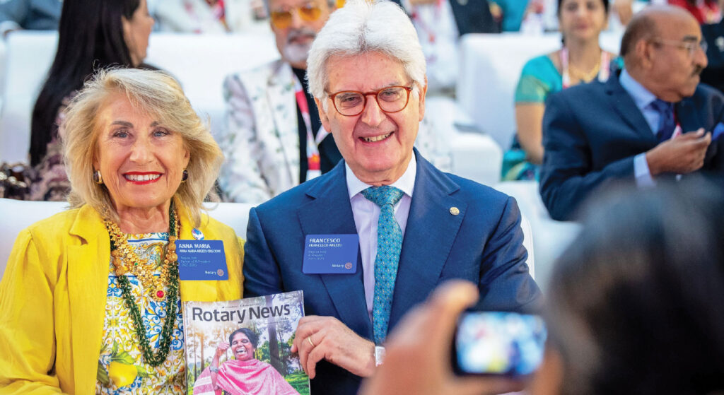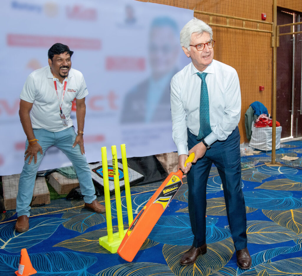 RI President Francesco Arezzo and his wife Anna Maria display a copy of Rotary News to the Editor. President Arezzo’s aide John de Giorgio takes a selfie with RI Director Christine Buering, his wife Monique Chambers and President Arezzo. (From L) TRF Trustee Bharat Pandya, PRID A S Venkatesh, RID Christine and Vinita Venkatesh.TN Deputy CM Udhayanidhi Stalin lights a lamp as (from R) School Education Minister Anbil Mahesh Poyyamozhi, Lead25 co-convener RID K P Nagesh and event chairman PDG John Daniel look on. President Arezzo steps out of an autorickshaw at the inaugural of the Pink Auto project of RID 3234.President Arezzo and Anna share a lighter moment with Lead25 convener RI Director M Muruganandam and Sumathi. PDG Daniel is seen behind.PRID C Basker and his wife Mala.RIDs Muruganandam and Nagesh with Lead Committee members.President Arezzo plays cricket at the House of Friendship.Trustee Pandya greets President Arezzo and Anna.Camaraderie: RID Muruganandam, President Arezzo, Anna, RID Nagesh, his wife Uma, and Sumathi, engage in banter as de Giorgio and Monique look on.