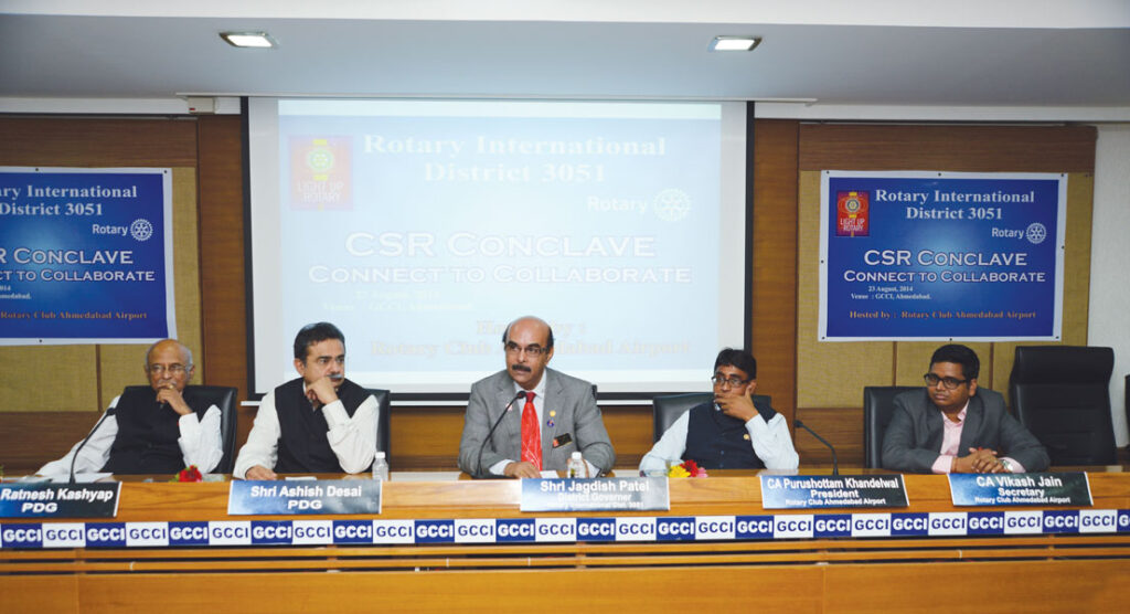 A CSR conclave was ­organised by Rotary International ­District 3051 at Gujarat ­Chambers of ­Commerce & Industries, Ahmedabad on August 23, 2014. The meeting, hosted by RC Ahmedabad Airport, aimed at harnessing the prospects for possible CSR partnership with ­corporate organisations, further to the newly included provisions ­pertaining to Corporate Social Responsibility (CSR) in the ­Companies Act, 2013, for it was a good opportunity for Rotary to get access to sizable corporate fund for various service projects.