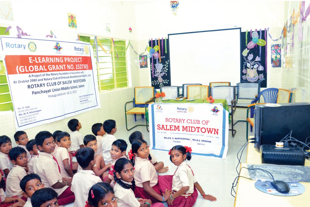This computer-aided teaching “is attractive and will create an interest in the students and encourage them to continue their studies,” says DG Dr Gunasekaran, D 2981. URLs enabling easy selection of content from websites were emailed to the teachers who will be periodically trained to upgrade their computer skills.
