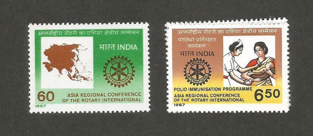 In India too Rotary Stamps have been issued; a set of two stamps were issued in 1987 to commemorate the Asia Regional Conference held at New Delhi and Rotary’s Polio Immunisation in 1998. India again issued a stamp of Rs. 8 denomination commemorating the Rotary Council on Legislation held at New Delhi on January 12, 1998, and the centennial issue of Rotary services in 2005.