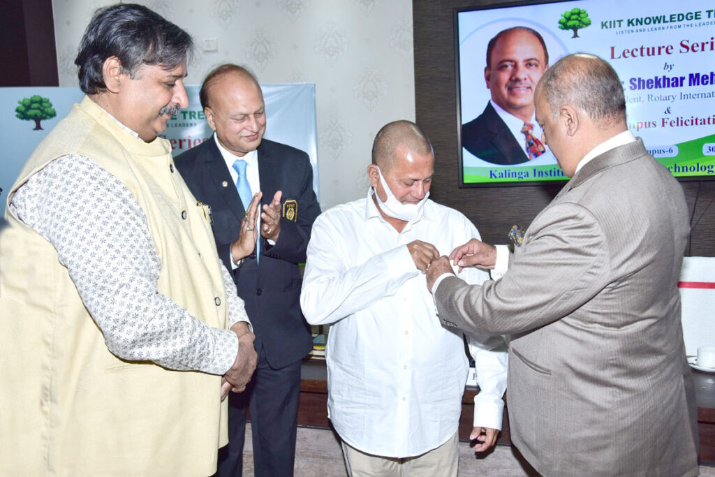 Mehta inducted Samanta into Rotary by putting a Rotary lapel pin on him. The renowned social worker, also an MP, has received many civilian honours from different countries for his mission to eradicate global hunger and poverty through free education through his Art of Giving movement. Mehta noted that the educationist has all the attributes of an ideal Rotarian and “Rotary is proud to have Samanta as its member.” The event was attended by DG Santanu Kumar Pani, PDGs and senior Rotarians from RID 3262, besides academicians from both the institutes.