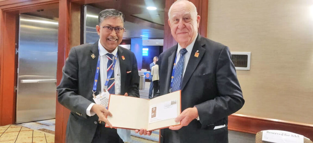 TRF Trustee Chair John Germ accepted a special Envelope and Cancellation released to commemorate the rural sanitation project Right-To-Go of RC Thane Hills, RID 3142. PDG Dr Ashes Ganguly presented the stamp to him at the CoL in Chicago, US.