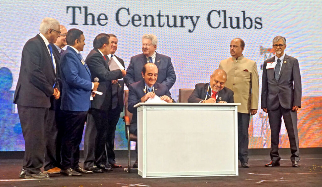 In a significant gesture to knit all the 100-plus-year-old Rotary clubs across the world, RC Calcutta, RID 3291, entered into a memorandum of agreement (MoA). Club Presidents Purnendu Roy Chowdhury of RC Calcutta and Jackie Rodriguez of RC Manila signed the understanding in the presence of RI President Mark Maloney, RIPN Shekhar Mehta and Nick Locsin, Chairman, International Relations Committee from Manila, Philippines. Later, RC Shanghai will be inducted into this Circle of Centennial Rotary Clubs to offer a platform to share best practices and create a special bond of fellowship, said DG Ajay Agarwal, District 3291.