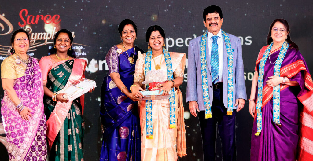 A swirl of colour, creativity and culture, the event celebrated the saree not merely as an attire, but as a story of India woven into six yards of fabric. The ramp walk featured powerful thematic presentations expressed through innovative saree styling. One segment honoured India’s ‘warrior women,’ blending strength and femininity in regal woven sarees; another drew warm applause as a confident ‘Lady James Bond’ strode the ramp in a Kanchivaram saree paired with a modern denim blouse, boots and cowboy hat, playfully merging tradition with modernity.
