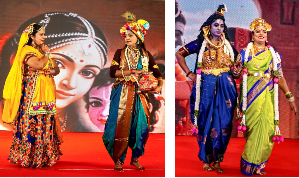 Also interesting was a presentation by a traditionally dressed mother and her Gen Z daughter in a modern-styled saree, symbolising continuity across generations. The audience was also treated to vibrant portrayals of Lord Krishna and his mythological companions, as well as Shiva and Parvati, all draped in rich, ancient-style sarees that evoked the grandeur of classical India.