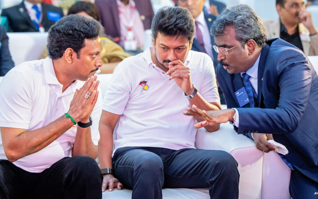 TN Deputy CM Udhayanidhi Stalin as (from L) School Education Minister Anbil Mahesh Poyyamozhi, PDG I S A K Nazar and conclave convener RI Director M Muruganandam look on.