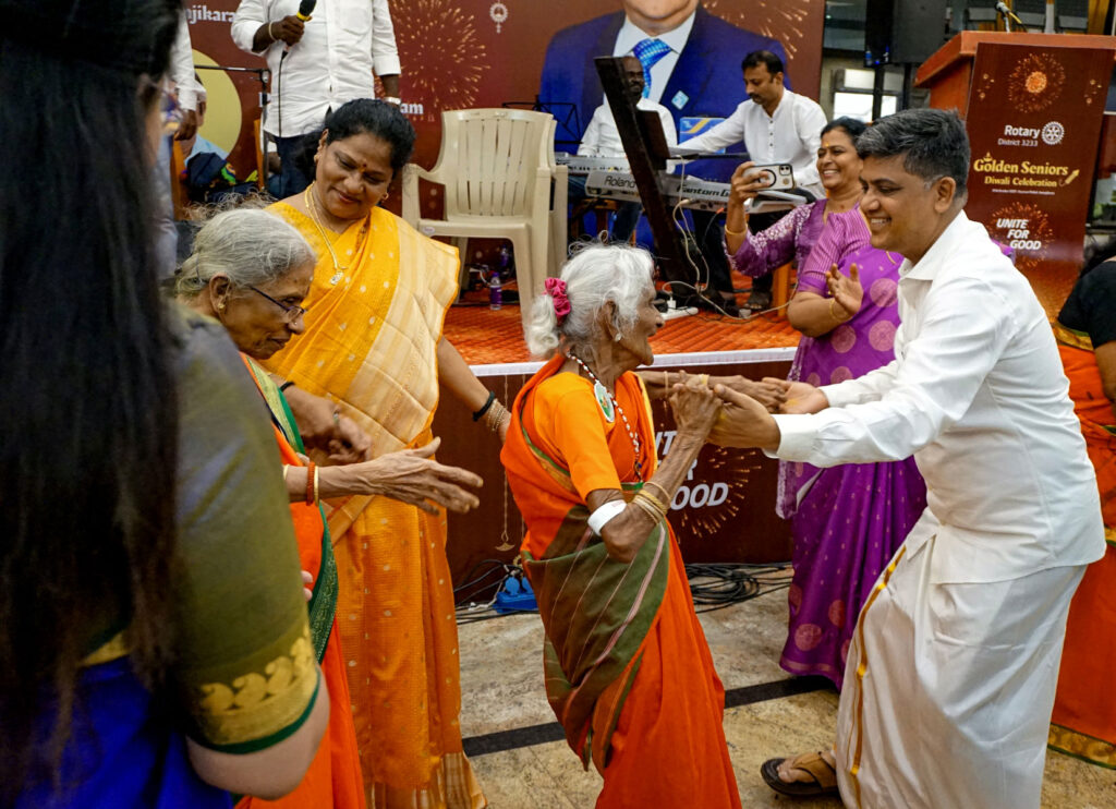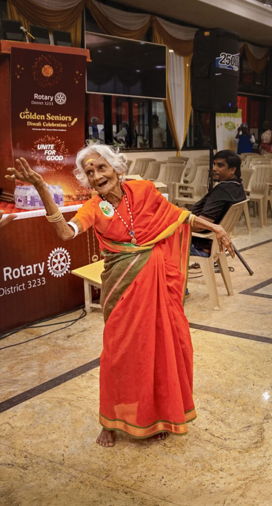 The song Andru vanthathum ithe nila from the 1963 Tamil classic Periya Idathu Penn played out loud in the hall. Ninety-seven-year-old Lalitha, draped in a bright orange sari, rose to her feet, her hands moving in perfect rhythm, and her eyes shining with a dancer’s grace. Within moments others joined her, and laughter and claps filled the hall. DG D Devendran and other Rotarians joined her on the dance floor.