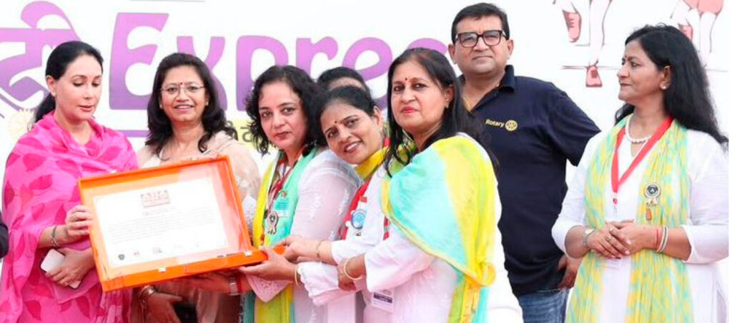 Rajasthan deputy CM Diya Kumari and RID 3053 DG Nisha Shekhawat present certificate from Asia Book of Records to Vibha Bhoot, president, RC Jodhpur Sanskar. PDG Priyesh Bhandari is also seen.