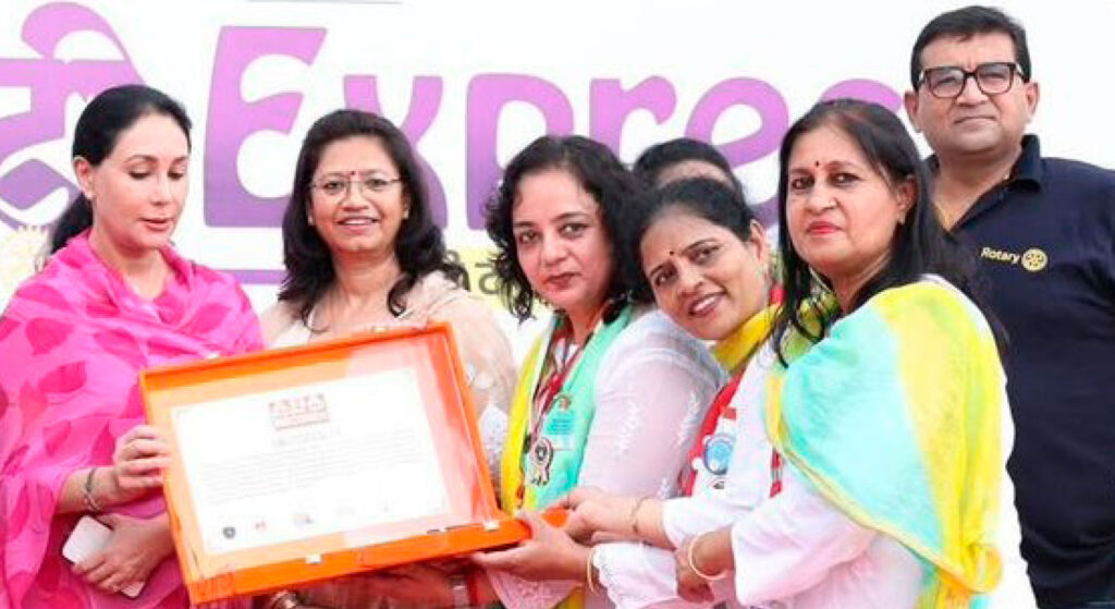Rajasthan deputy CM Diya Kumari and RID 3053 DG Nisha Shekhawat present certificate from Asia Book of Records to Vibha Bhoot, president, RC Jodhpur Sanskar. PDG Priyesh Bhandari is also seen.