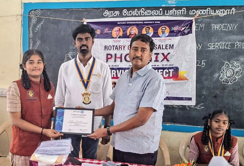After much planning and deliberations, the club inaugurated its maiden Interact Club of Phoenix, “at a government school in Salem with 23 charter members, who are students of Class 8–10, with the then AG Badrinarayana Gupta presenting the RI citation to charter secretary Ansal Sunil.” During the Interact installation at the Government Higher Secondary School, Maniyanoor, near Salem, an RO filter unit worth ₹8,000 was installed for providing drinking water to 900 students (up to Class 12) and 30 teachers. “A sanitary pad vending machine (₹7,000) was also set up, and we directed charter president Sujithra to ensure that the device is put to good use and restocked every fortnight,” recalls Hemanath.