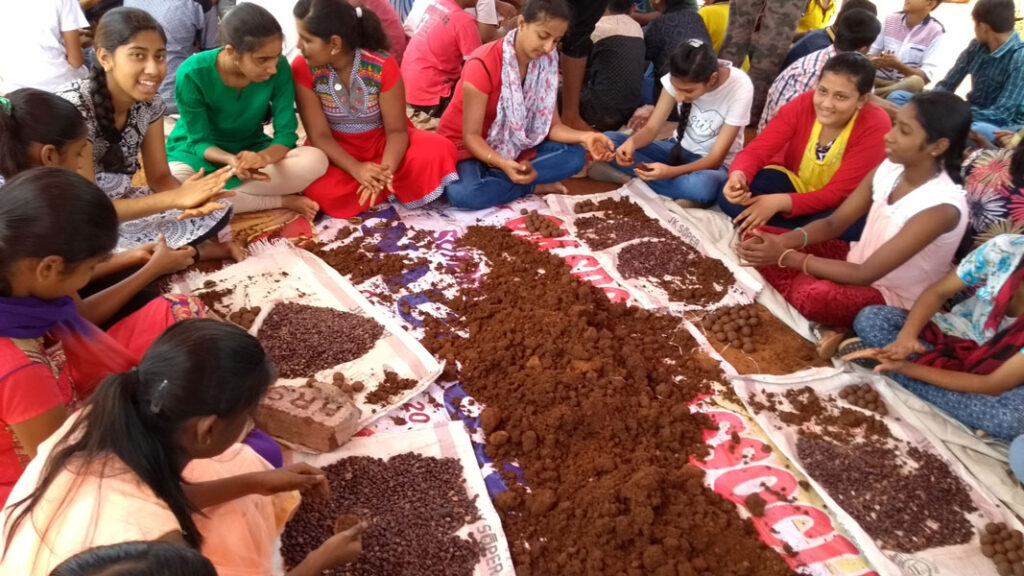 Seed balls comprise a mixture of fertile red soil, cow dung, cow urine and other bio compost. The semi-solid mix is prepared by adding water proportionate to the quantity of the mixture, after which a particular plant seed is inserted in it. These semisoft seed balls are allowed to dry in the sun and stored for later use. They are scattered near hills, lakes, ponds so that they sprout and become plants and eventually trees that help to capture and retain rainwater. More than 50 per cent of the seed balls germinate into new plants.