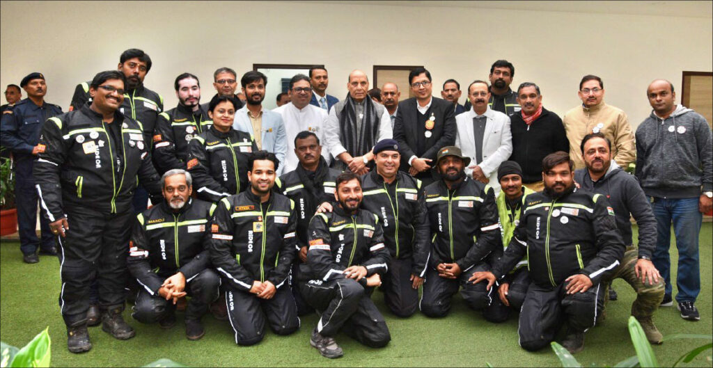 Participants of the Ride for Bharat ke Veer with Defence Minister Rajnath Singh (standing centre).
