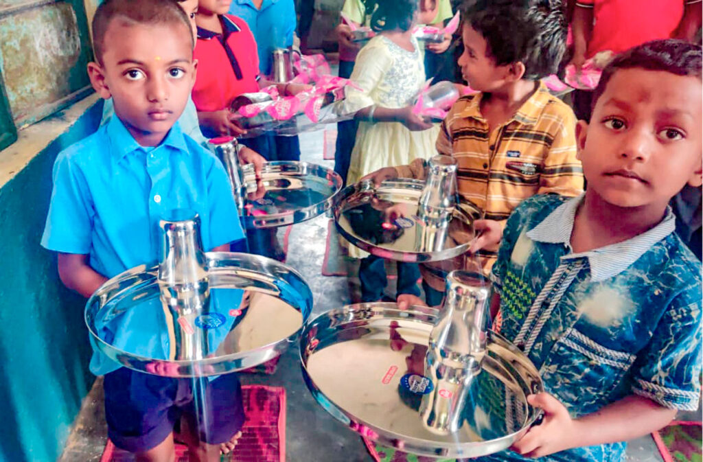 More goodies came pouring in. On her next visit to the school, she carried glasses and plates for the children from RC Koramangala. “They say, when it rains, it pours. Member of the Inner Wheel Club of Koramangala (where too she is a member) came with school bags. They were moved on seeing the children sitting on the ground in damp conditions, so on their next visit, they brought six Nali-Kali tables and 36 chairs, as well as curtains. And in April they are coming back with uniforms for the children!”