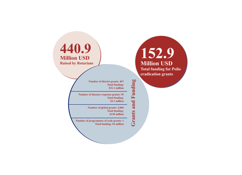 This past Rotary year, we set an ambitious fundraising goal of $410 million. Rotarians rallied together and helped the Foundation surpass the goal and raise over $440.9 million. These funds have boosted our efforts to eradicate polio, empower peacebuilders from around the world and support member-led project implementation across our areas of focus through district and global grants. Thanks to the generosity of Rotarians and friends of our Foundation, we awarded more than $143 million towards global grants in 2020–21. Grants for polio eradication totalled $152.9 million.