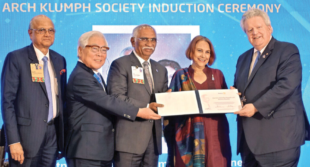 RI General Secretary John Hewko, who inducted two AKS members, PDG J B Kamdar and Marlene (the Chair circle with a contribution of $500,000) from RID 3232 and Kishorilal Jhunjunwala from RID 3142, said the Arch Klumph Society was growing rapidly, and now has 1,000 members, with India having the second highest number of AKS members. “At the One Rotary Centre (in Evanston) we have a nice AKS gallery on the 17th floor. When we set it up a few years ago, we figured we had at least 10–15 years left before we ran out of space. But the AKS has exploded with so many generous donors that we anticipate it will need to be expanded in five years.”