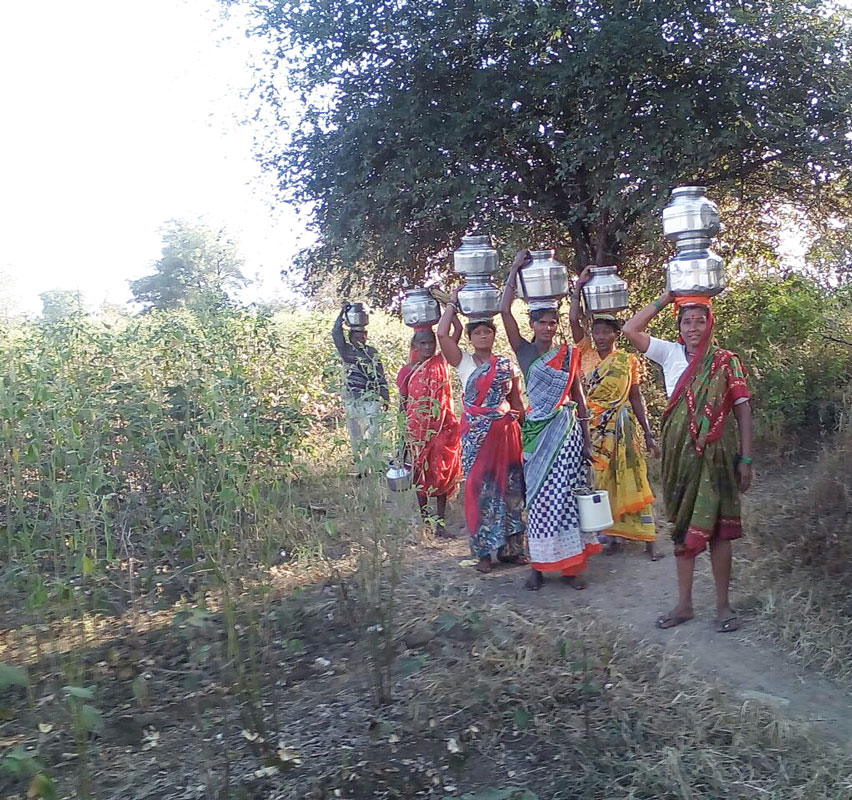 Village women in India have to carry 1–3 pots over their heads depending on their household needs, and make 2–3 trips of 2–5 km in the heat or rain every day. They are prone to spine and back problems because they carry so much weight over their heads, says Amrish Daftary, Rotary Water Projects Avenue Chair, RID 3141.